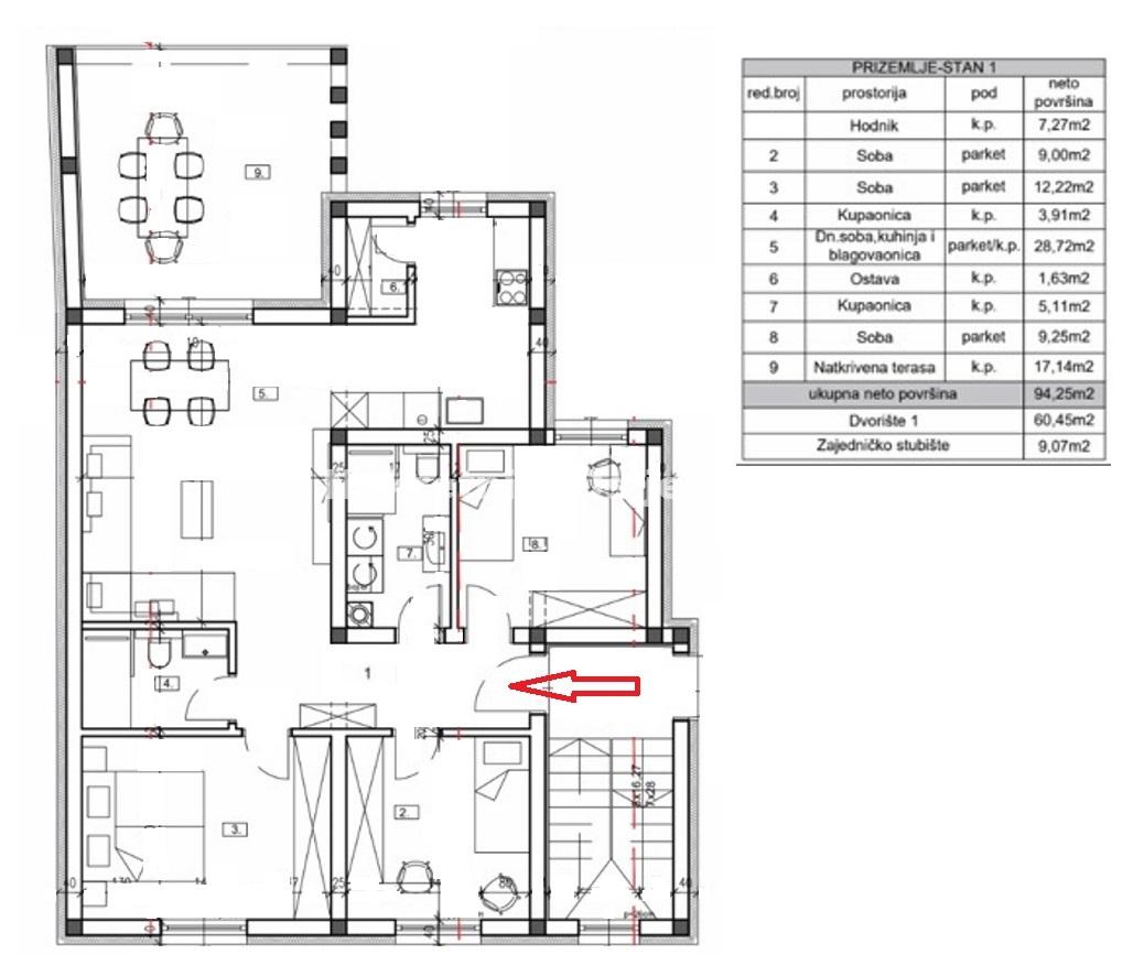 -Sastoji se od; hodnika, dnevni boravak s kuhinjom i blagovaonicom, 3 spavaće sobe, 2 kupaonice, ostava, natkrivena terasa.